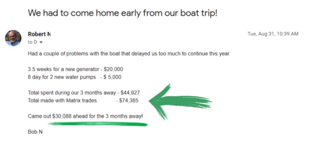 Robert, who says he made $74,385 profit in 3 months (enough to pay for ALL of his boat repairs and still have $30k to spare!)